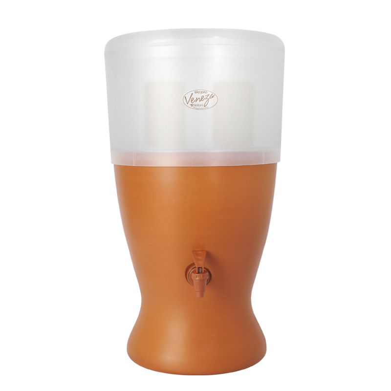 O filtro Veneza tem um design moderno e sóbrio que combina um recipiente plástico resistente na parte superior com a tradicional base de argila, que conserva a água fresca e natural.