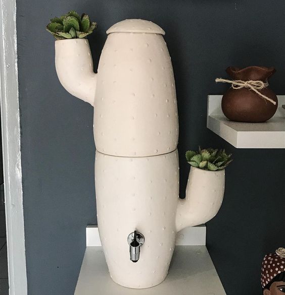 Para manter a qualidade de sua água, troque a vela de filtragem periodicamente, a cada 6 meses, não ultrapassando de 1 ano. Limpe o interior do filtro somente com água; sem bucha, sabão, ceras ou químicos. Os tons da cerâmica são totalmente naturais, resultado do uso do “oleio”: barro diluído com pigmentos locais como o tauá e a tabatinga. O filtro pode sofrer variação de tonalidade e escurece em contato com a água, fazendo dela uma peça única. A cerâmica ‘transpira’, pois mantém a temperatura da água inferior à do ambiente externo, sempre fresca. Também pode ocorrer o vazamento de um pouco d’água no início do uso, até o barro se condensar por completo. Queimada nos fornos caseiros do Vale do Jequitinhonha, esta é uma cerâmica de baixa temperatura (800 graus). Sua resistência é limitada, portanto pode lascar ou descascar. Evite atritos e a trate com carinho. Decore! Os espaços para plantas não possuem ligação com o espaço da água, porém, dê preferência ao uso de cachepôs ou espumas florais, ao invés de plantar a terra em contato direto com o barro. Você também pode enchê-los d’água e deixar folhas e flores repousando. Esta peça suporta de 2 a 3 litros de água filtrada, e acompanha, vela de filtragem e espuma floral.